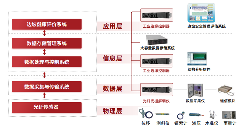 在能源礦山領域,尾礦庫是礦山選礦廠生產不可缺少的設施。但由于其建設過程往往需要筑壩攔截谷口或圍地,成為了具有高勢能的人造泥石流危險源,在汛期存在潰壩危險,易造成特大事故。為保障礦山生產的安全穩定,國家重點黃金冶煉企業基于曙光GWR-3230H工業邊緣控制器與國產軟件,利用光纖光柵傳感技術,打造光纖光柵解調儀,通過各類傳感器采集礦山邊坡數據。同時,利用GWR-3230H工業邊緣控制器的高性能、高可靠特性,在礦山現場部署結構分析軟件和邊坡安全管理評估系統,從物理層、數據層、信息層和應用層打造完整的礦山邊坡監測系統。