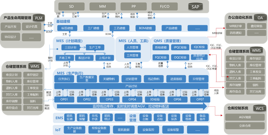 項(xiàng)目應(yīng)用信息模型等技術(shù)打通自動化生產(chǎn)與運(yùn)營系統(tǒng),搭建統(tǒng)一數(shù)據(jù)采集和分析平臺,支持生產(chǎn)、質(zhì)量、設(shè)備、能耗等數(shù)據(jù)的采集與多維度分析。項(xiàng)目開發(fā)的MOM平臺集成了MOM、QMS、EAM、EMS等自動化生產(chǎn)與運(yùn)營功能,并預(yù)留統(tǒng)一數(shù)據(jù)接口,支持現(xiàn)有和正在建設(shè)的PLM、SCADA、WMS等系統(tǒng)集成,實(shí)現(xiàn)生產(chǎn)排程、過程管控、產(chǎn)品質(zhì)量管理、設(shè)備維護(hù)、能源監(jiān)控等的智能化,輔助企業(yè)決策,具體實(shí)施方案如圖2所示。