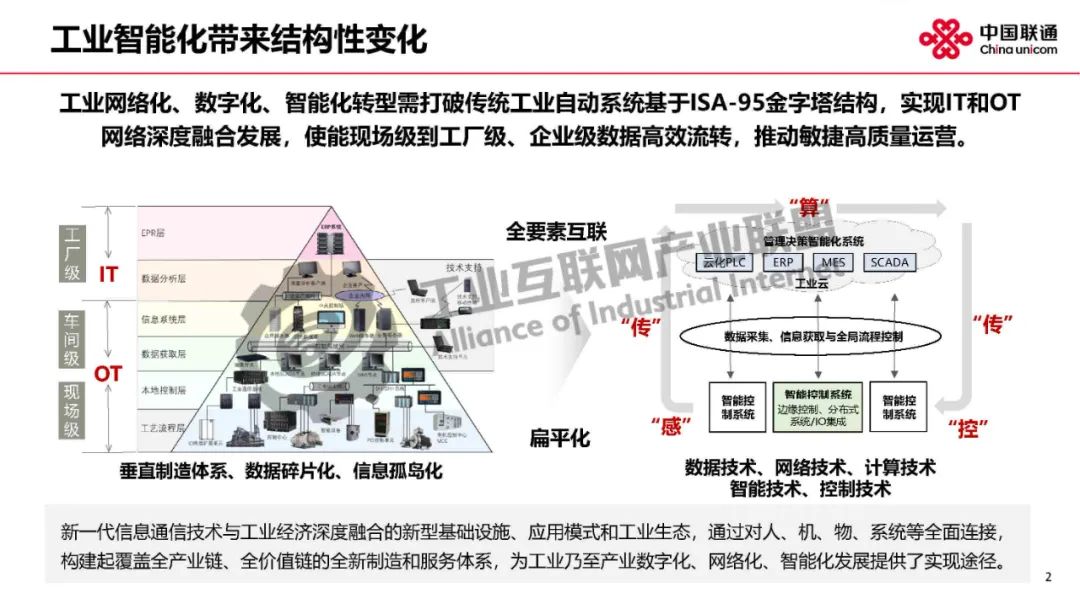 黃蓉介紹,工業網絡化、數字化、智能化轉型需打破傳統工業自動系統基于ISA-95金字塔結構,實現IT和OT網絡深度融合發展,使能現場級到工廠級、企業級數據高效流轉,推動敏捷高質量運營。工業數據的全面感知、高效傳輸、實時計算和智能管控,需要新一代工業網絡和控制系統,加速打破原有七國八制基礎設施,推動統一、開放、協同的基礎設施。打造新型工業網絡,一方面應持續夯實5G+工業互聯網等規模化應用,另一方面應不斷探索工業智能化深化應用下新的生產模式、交互模式,從而明確對網絡基礎設施的新的需求。