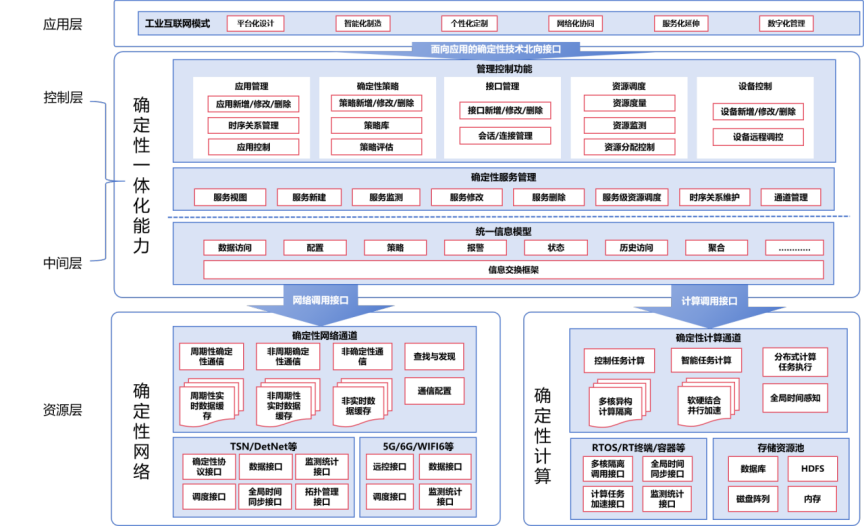 面向應(yīng)用的確定性技術(shù)架構(gòu)如下圖所示,與傳統(tǒng)工業(yè)網(wǎng)絡(luò)架構(gòu)不同的是,通過確定性一體化能力在資源之上的層面統(tǒng)籌確定性網(wǎng)絡(luò)和確定性計算。其中,確定性服務(wù)管理創(chuàng)新性地圍繞工業(yè)生產(chǎn)中應(yīng)用協(xié)同關(guān)系編排算網(wǎng)資源,并保障整個流程的確定性。確定性服務(wù)的指標可以落地到確定性網(wǎng)絡(luò)指標和確定性計算指標,從而滿足控網(wǎng)算融合過程中的緊密協(xié)同需求。管理控制功能提供了應(yīng)用、策略、設(shè)備、資源等全局調(diào)度能力,相關(guān)策略對全工廠的確定性服務(wù)進行動態(tài)優(yōu)化,再將配置信息通過統(tǒng)一信息模型、網(wǎng)絡(luò)調(diào)用接口和計算調(diào)用接口下發(fā)到資源層。