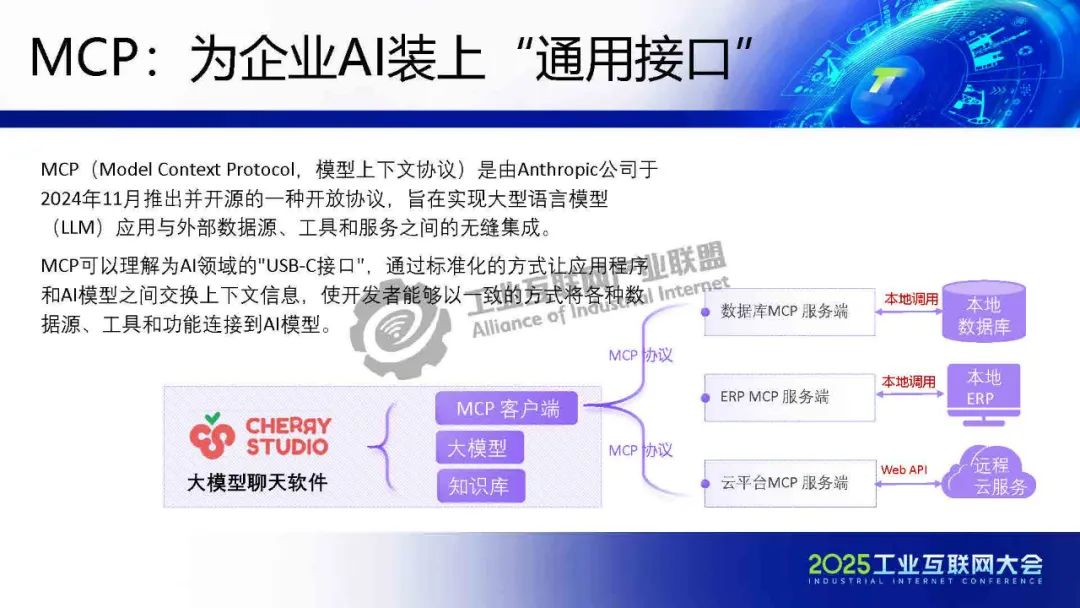 5月22日,在2025工業(yè)互聯(lián)網(wǎng)大會“人工智能與工業(yè)互聯(lián)網(wǎng)融合創(chuàng)新發(fā)展專題活動”上,理工比特林克(蘇州)軟件信息技術(shù)服務(wù)有限公司技術(shù)總監(jiān)賀松發(fā)表了《MCPFLow:構(gòu)建工業(yè)互聯(lián)網(wǎng)AI應(yīng)用的連接器與創(chuàng)新生態(tài)》的主題演講。