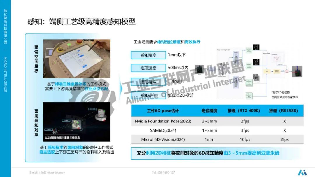 唐淼鑫介紹,工業場景要求絕對定位精度和高效執行,充分利用2D特征將空間對象的6D感知精度由3~5mm提高到亞毫米級。對復雜構面建立統一的向量化表達方式,根據產品類型、材質、表面曲率、工作面特性、工具頭配置等輸入和工藝結果輸出,實現工藝的算法化,并且工藝準確性隨著產品的鋪開而逐漸增強。