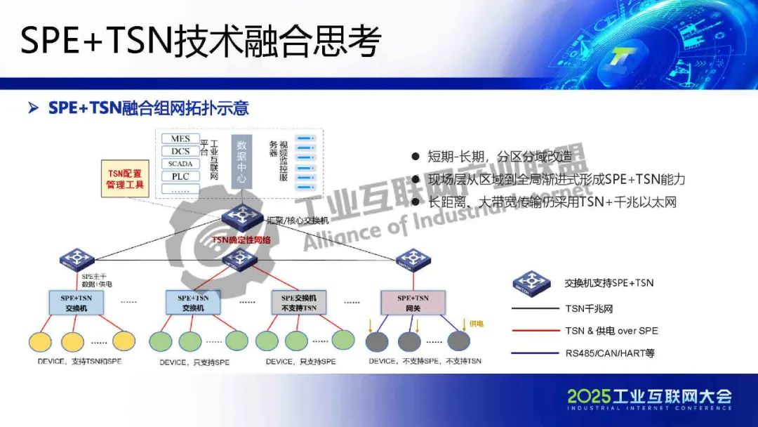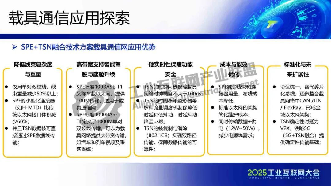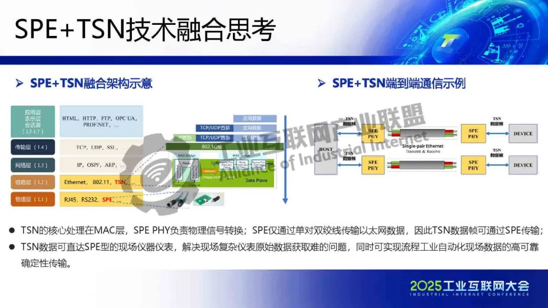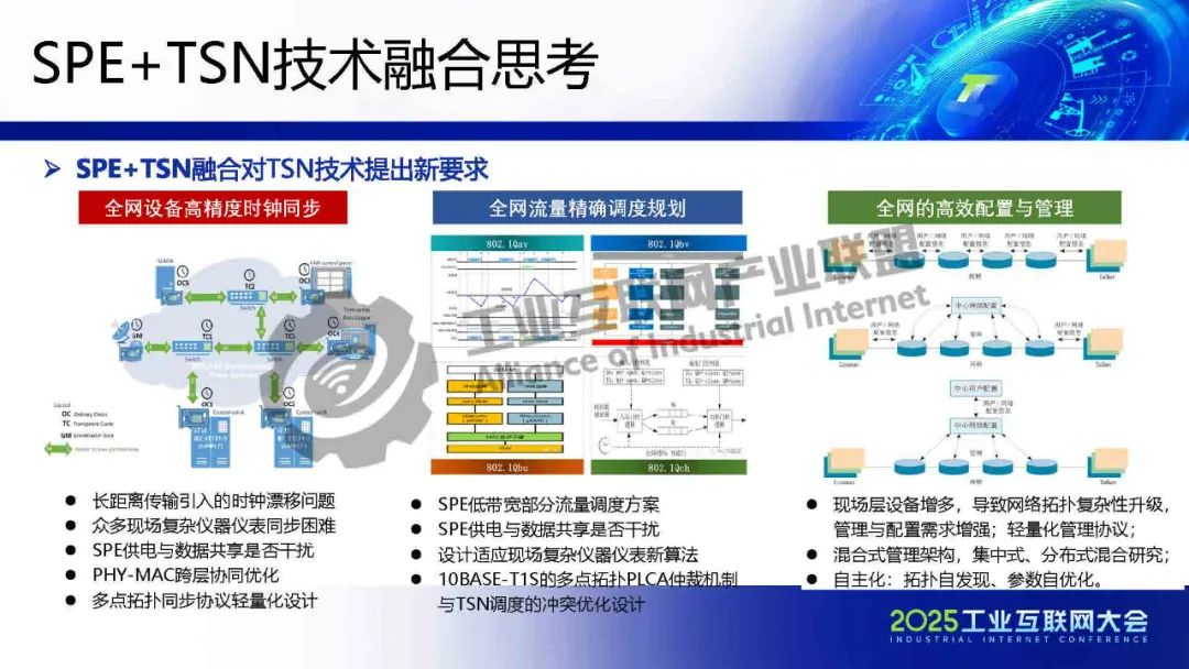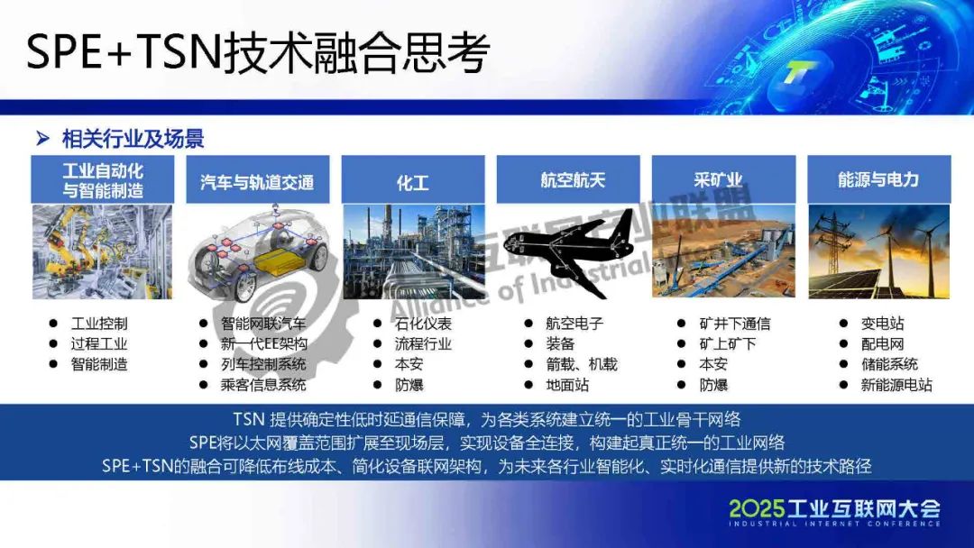 李慶介紹,TSN 提供確定性低時(shí)延通信保障,為各類系統(tǒng)建立統(tǒng)一的工業(yè)骨干網(wǎng)絡(luò)。SPE將以太網(wǎng)覆蓋范圍擴(kuò)展至現(xiàn)場層,實(shí)現(xiàn)設(shè)備全連接,構(gòu)建起真正統(tǒng)一的工業(yè)網(wǎng)絡(luò)。SPE+TSN的融合可降低布線成本、簡化設(shè)備聯(lián)網(wǎng)架構(gòu),為未來各行業(yè)智能化、實(shí)時(shí)化通信提供新的技術(shù)路徑。