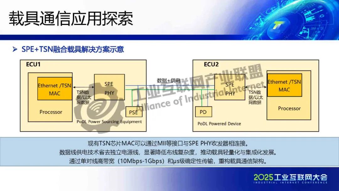 現(xiàn)有TSN芯片MAC可以通過MII等接口與SPE PHY收發(fā)器相連接。數(shù)據(jù)線供電技術(shù)省去獨(dú)立電源線,顯著降低布線復(fù)雜度,推動載具輕量化與集成化發(fā)展。通過單對線高帶寬(10Mbps-1Gbps)和μs級確定性傳輸,重構(gòu)載具通信架構(gòu)。