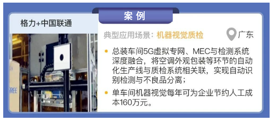 格力與中國聯(lián)通合作,在廣東省利用5G技術(shù)部署了機器視覺質(zhì)檢場景的應(yīng)用。在格力電器的總裝車間,聯(lián)通以一套獨立 MEC 為格力打造了工業(yè)虛擬專網(wǎng),實現(xiàn)生產(chǎn)控制網(wǎng)與生產(chǎn)管理網(wǎng)融合,在模擬場景中基于樣本訓(xùn)練建立數(shù)據(jù)模型,在需要自動檢測的工位上安裝5G高清攝像頭,與自動化生產(chǎn)線同頻聯(lián)調(diào),在實際生產(chǎn)中利用5G網(wǎng)絡(luò)將待檢內(nèi)容自動拍照,照片視頻流上傳至部署在MEC平臺的機器視覺質(zhì)檢應(yīng)用,運用圖形處理單元(GPU)大算力資源與數(shù)據(jù)模型做實時比對分析檢查,實現(xiàn)設(shè)備自動識別,檢測結(jié)果以毫秒級時延返回現(xiàn)場端,自動化生產(chǎn)線與質(zhì)檢系統(tǒng)關(guān)聯(lián)做出不良品分離操作。5G 虛擬專網(wǎng)、MEC 平臺與檢測系統(tǒng)深度融合,為機器視覺質(zhì)檢應(yīng)用的數(shù)據(jù)傳輸和信息處理提供了強大保障。目前格力已在其總部總裝生產(chǎn)線的空調(diào)外觀包裝、壓縮機線序、空調(diào)自動電氣安全測試等環(huán)節(jié)中部署了5G機器視覺質(zhì)檢應(yīng)用,單車間機器視覺每年可為企業(yè)節(jié)約人工成本 160 萬元。