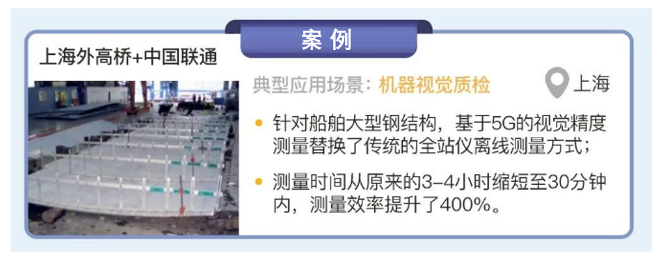上海市外高橋造船有限公司與中國聯(lián)通合作,在上海市開展“5G+工業(yè)互聯(lián)網(wǎng)”在船舶行業(yè)的落地應(yīng)用,搭建 5G 專網(wǎng),融合 MEC 技術(shù),實現(xiàn)了基于5G的機器視覺檢測場景的應(yīng)用。使用工業(yè)相機+靶點的測量模式進行大型鋼結(jié)構(gòu)精度測量,通過 5G 專網(wǎng)及邊緣云,實時回傳、解算現(xiàn)場拍攝圖片,生成點位文件。基于5G 的視覺精度測量替換了傳統(tǒng)的全站儀離線測量方式,將測量時間從原來的3-4小時,縮短至 30 分鐘內(nèi),測量效率提升了400%。
