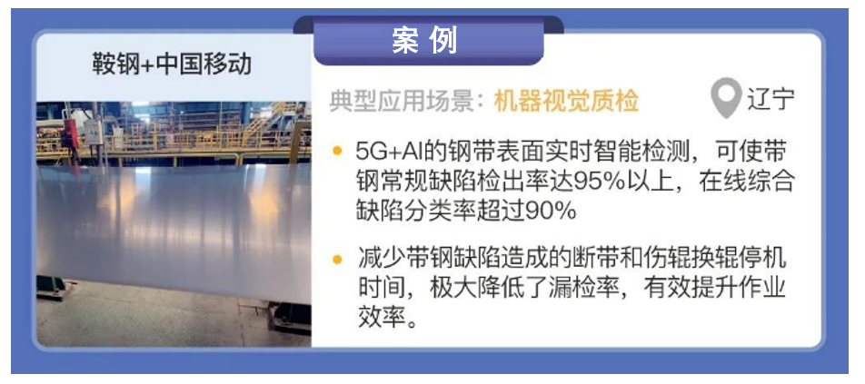 鞍鋼與中國移動合作,在遼寧省開展了“基于5G 的機器視覺帶鋼表面檢測平臺研發(fā)與應(yīng)用”項目建設(shè),實現(xiàn)了機器視覺質(zhì)檢場景的應(yīng)用。在機器視覺質(zhì)檢方面,通過部署工業(yè)相機拍攝高清圖片、采集質(zhì)檢數(shù)據(jù),利用 5G 網(wǎng)絡(luò)將采集到的冷軋現(xiàn)場4K/8K等高清圖像數(shù)據(jù)回傳至操作室平臺,通過平臺的視覺AI 分析能力對圖像進行處理分析,完成帶鋼表面缺陷的實時檢測;同時,帶鋼軋制速度極高,通過帶鋼表面的反光斑馬條紋反饋帶鋼的平整度,用于帶鋼生產(chǎn)質(zhì)量的實時檢測,為張力輥等調(diào)節(jié)提供依據(jù)。方案部署完成后,帶鋼常規(guī)缺陷檢出率達95%以上,在線綜合缺陷分類率超過 90%,提高成材率的同時減少了帶鋼缺陷造成的斷帶和傷輥換輥停機時間。