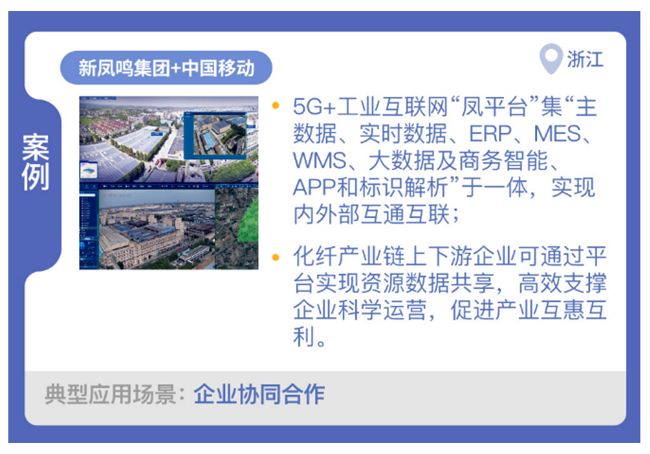 新鳳鳴集團(tuán)股份有限公司與中國移動(dòng)合作,搭建化纖產(chǎn)業(yè)5G+工業(yè)互聯(lián)網(wǎng)平臺“鳳平臺”,實(shí)現(xiàn)了企業(yè)協(xié)同合作場景的應(yīng)用。平臺集“主數(shù)據(jù)、實(shí)時(shí)數(shù)據(jù)、企業(yè)資源計(jì)劃(ERP)、MES、WMS、大數(shù)據(jù)及商務(wù)智能、應(yīng)用程序(APP)和標(biāo)識解析”于一體,實(shí)現(xiàn)內(nèi)外部互通互聯(lián)。通過鳳平臺整合從市場、銷售到生產(chǎn)物流全環(huán)節(jié)等資源,構(gòu)建靈活組織能力,實(shí)現(xiàn)產(chǎn)品配送、自提一體化管理,采、產(chǎn)、銷一體化分析和內(nèi)外貿(mào)物流一體化運(yùn)營,實(shí)時(shí)掌握化纖生產(chǎn)訂單及質(zhì)量數(shù)據(jù)。利用5G技術(shù)和5G工業(yè)模組、工業(yè)網(wǎng)關(guān)、工業(yè)PLC等5G終端,貫穿化纖產(chǎn)業(yè)上下游,對生產(chǎn)環(huán)節(jié)關(guān)鍵設(shè)備實(shí)現(xiàn)實(shí)時(shí)監(jiān)控。化纖產(chǎn)業(yè)鏈上下游企業(yè)可通過平臺實(shí)現(xiàn)資源數(shù)據(jù)共享,高效支撐企業(yè)科學(xué)運(yùn)營,促進(jìn)產(chǎn)業(yè)互惠互利。