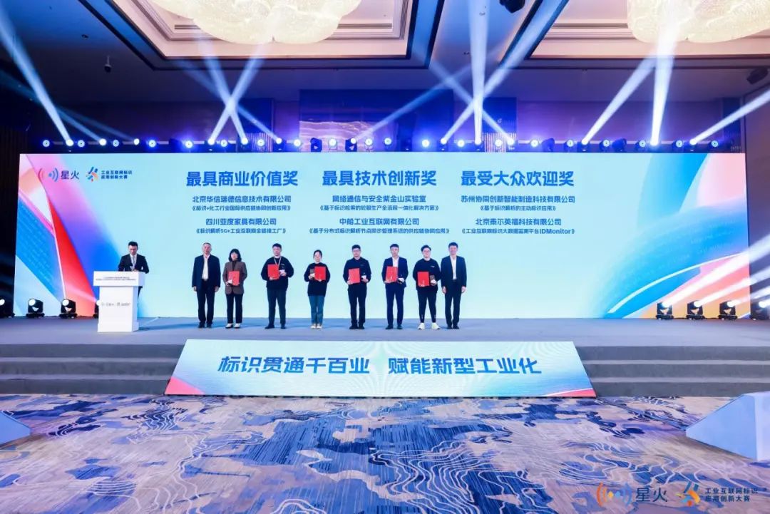 北京華信瑞德信息技術有限公司的《標識+化工行業(yè)國際供應鏈協(xié)同創(chuàng)新應用》,四川亞度家具有限公司的《標識解析5G+工業(yè)互聯(lián)網(wǎng)全鏈接工廠》獲最具商業(yè)價值獎;網(wǎng)絡通信與安全紫金山實驗室的《基于標識檢索的輪轂生產全流程一體化解決方案》,中船工業(yè)互聯(lián)網(wǎng)有限公司的《基于分布式標識解析節(jié)點同步管理系統(tǒng)的供應鏈協(xié)同應用》獲最具技術創(chuàng)新獎;蘇州協(xié)同創(chuàng)新智能制造科技有限公司的《基于標識解析的主動標識應用》,北京泰爾英福科技有限公司的《工業(yè)互聯(lián)網(wǎng)標識大數(shù)據(jù)監(jiān)測平臺IDMonitor》獲最受大眾歡迎獎。
