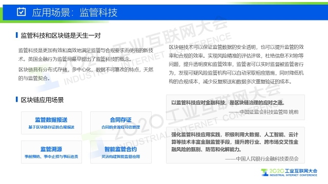 “區塊鏈技術可以保證監管數據的安全透明,也可以提升監管的效率和合規的效率。實現風險精準的評估評級,杜絕信息不對稱等問題,提升透明度和監管效率,監管者可以實時監督被監管者行為,發現可疑風險監管機構可以自動采取相應措施,同時降低機構的合規成本,減少反復報送和數據多次重復驗證的成本。”