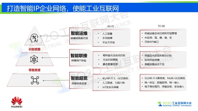 “未來的企業園區網絡應該具備三大特征,智能超寬、智能連接和智能運維。 智能超寬,對于網絡而言,這個超寬還必須有智能。以前是3G/4G、WIFI4/WIFI5,現在是5G、WIFI6,帶寬是原來的4倍以上;智能連接,以前只是連接起來,形成一個網絡,但未來的趨勢需要對園區的所有業務進行差異化;智能運維,借助于新的技術,大數據的分析以及AI,能夠把故障排查從以天/周為維度,變成按照分鐘級維度?!?/p>