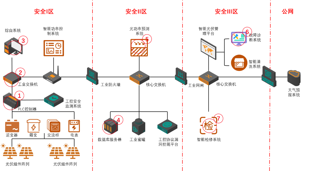 現場設備防護措施不到位,面臨暴力入侵。設備分布區域廣,普遍人煙稀少,預防預控成本高;對風機及光伏陣列運行狀態的自動化監視程度和巡檢人員網絡安全技術水平低。