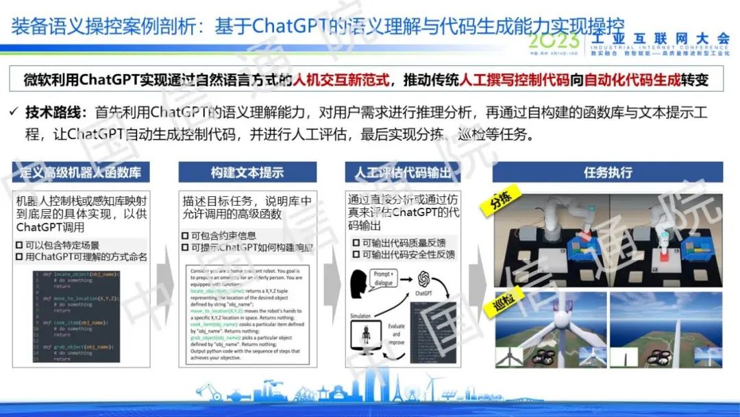 在裝備語義操控場景中,能夠利用ChatGPT的語義理解能力進(jìn)行機(jī)器人智能操控,其實(shí)現(xiàn)邏輯是定義高級機(jī)器人函數(shù)庫,再構(gòu)建文本提示,然后通過人工評估代碼輸出質(zhì)量,滿足質(zhì)量要求后機(jī)器人即可執(zhí)行分揀和巡檢等任務(wù),這意味著人機(jī)交互范式正在加速創(chuàng)新。
