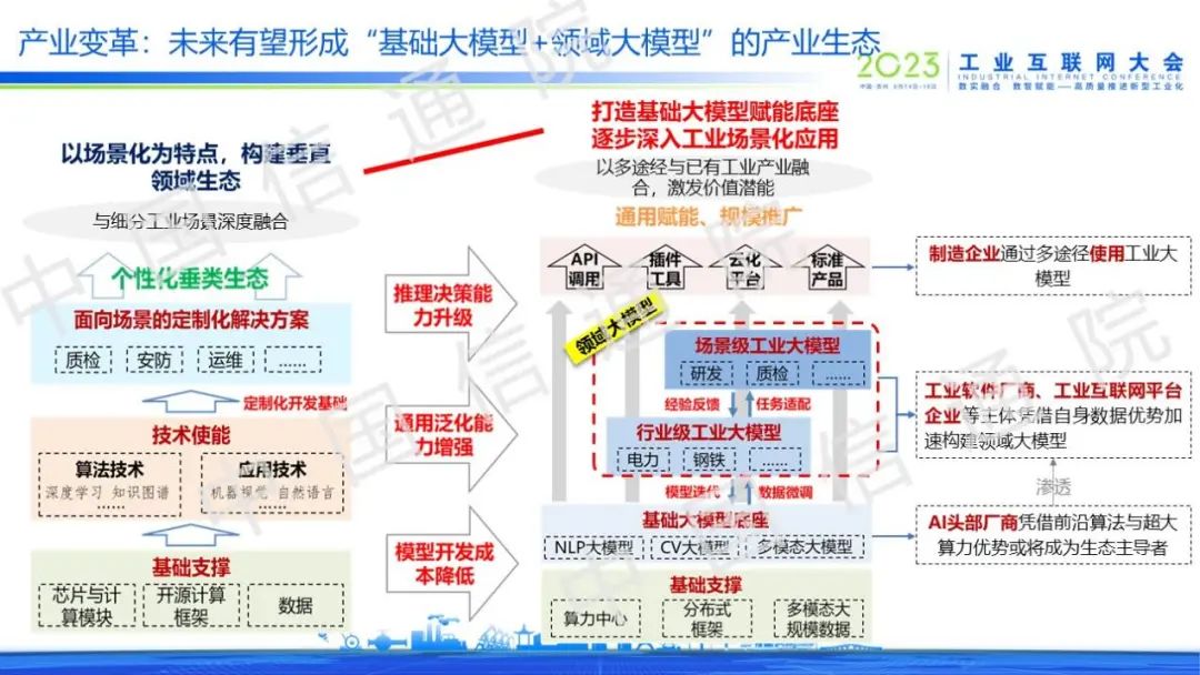 6月15日,2023工業(yè)互聯(lián)網(wǎng)大會在蘇州舉行,在“工業(yè)互聯(lián)網(wǎng)平臺創(chuàng)新發(fā)展”論壇上,中國信通院兩化所工互創(chuàng)新部王海萍指出,從應(yīng)用視角來看,工業(yè)大模型發(fā)展分為四個階段,當(dāng)前正處于以直接嫁接基礎(chǔ)大模型為主要模式的第一階段,并不斷向工業(yè)核心環(huán)節(jié)演進(jìn),逐步提升工業(yè)大模型多任務(wù)執(zhí)行能力;從產(chǎn)業(yè)視角來看,未來工業(yè)大模型有望形成“基礎(chǔ)大模型+領(lǐng)域大模型”的產(chǎn)業(yè)格局,其中領(lǐng)域大模型的企業(yè)主體類型將更加多樣、市場競爭將愈加激烈。