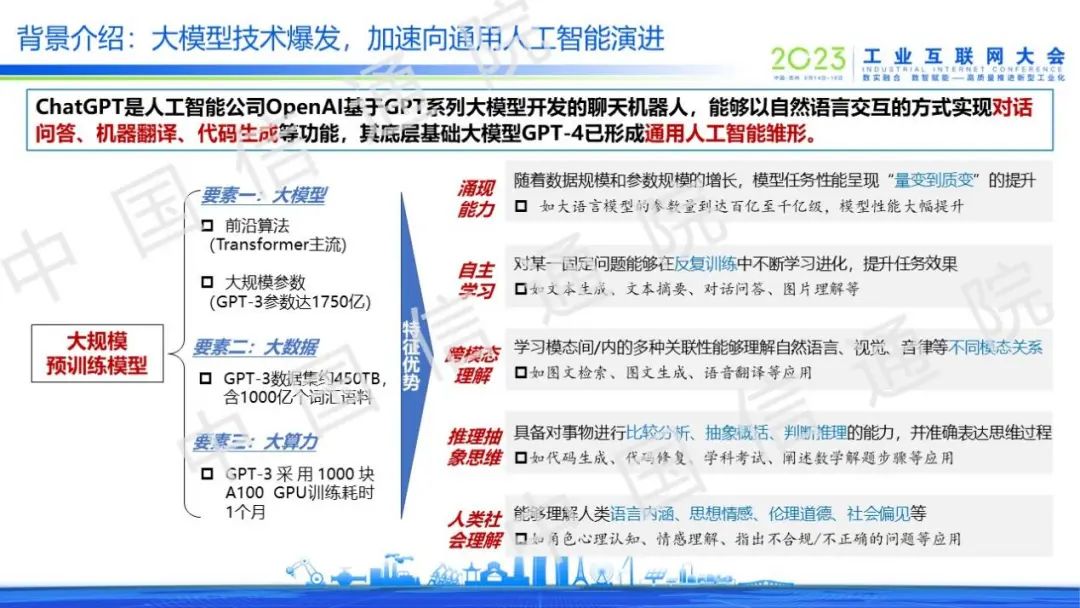 當(dāng)前,以ChatGPT為代表的大規(guī)模預(yù)訓(xùn)練模型已經(jīng)展現(xiàn)出涌現(xiàn)能力、自主學(xué)習(xí)、跨模態(tài)理解、推理抽象思維和人類社會理解等特征優(yōu)勢,已形成通用人工智能雛形,讓我們對傳統(tǒng)人工智能產(chǎn)生顛覆性認(rèn)知。