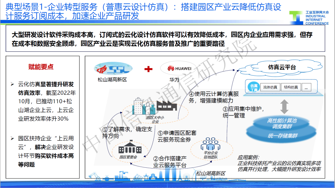 “典型場景”一是普惠云設計仿真,針對中小企業研發工具成本高的問題,某服務商通過建立仿真云平臺,一方面提供低成本的仿真工具,并基于平臺實現統一版本管理,降低企業使用成本。另一方面,打造高性能計算與存儲管理設施,為仿真工具提供算力支撐。目前,該應用已覆蓋110家中小企業,實現研發效率提升30%。