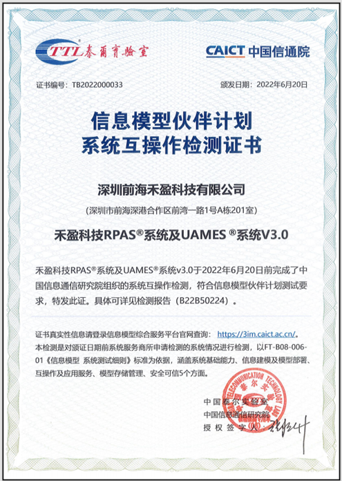 深圳前海禾盈科技有限公司(以下簡稱“前海禾盈”)自主研發(fā)的RPAS?智能自動化企業(yè)管理系統(tǒng)與UAMES?柔性化智能生產(chǎn)調(diào)度系統(tǒng),分別于2020年和2022年順利通過信通院組織的信息模型伙伴計劃互操作產(chǎn)品評測,其166個測試項目全部合格,并在本次論壇上獲頒證書。