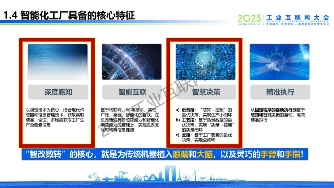 未來智能化工廠具備以下四個特征:深度感知,智能互聯,智慧決策和精準執行。“智改數轉”的核心,就是為傳統機器植入眼睛和大腦,以及靈巧的手臂和手指!