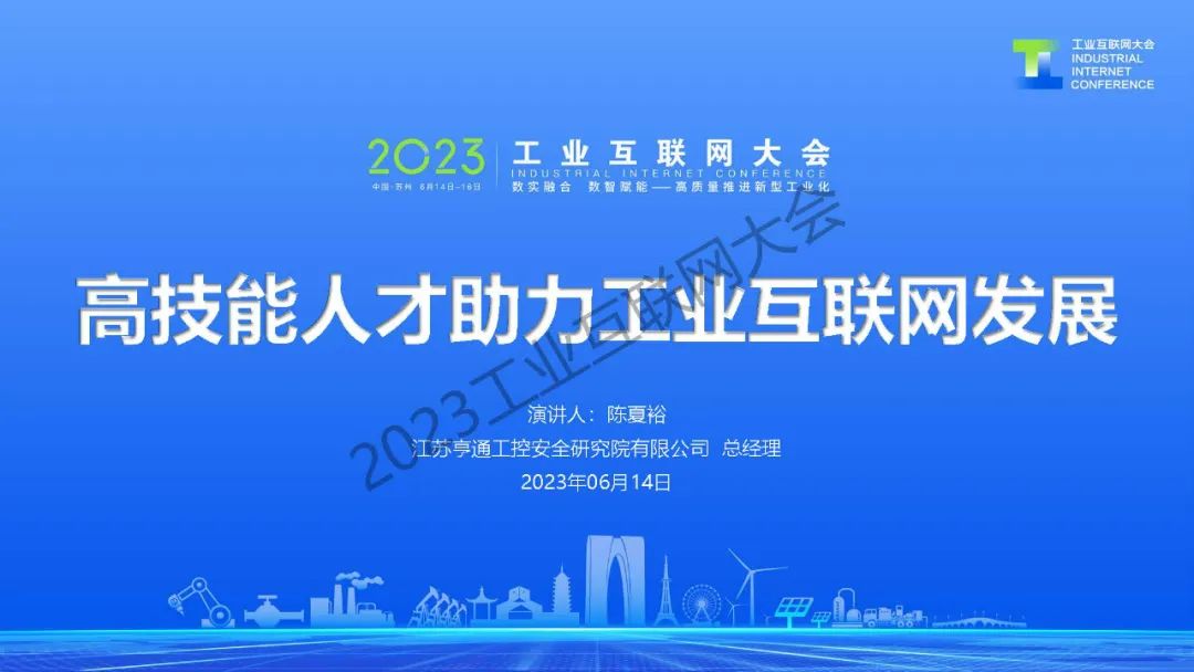 6月14日,在2023工業互聯網大會“工業互聯網人才發展論壇”上,江蘇亨通工控安全研究院有限公司總經理陳夏裕發表了《高技能人才助力工業互聯網發展》的主題演講。