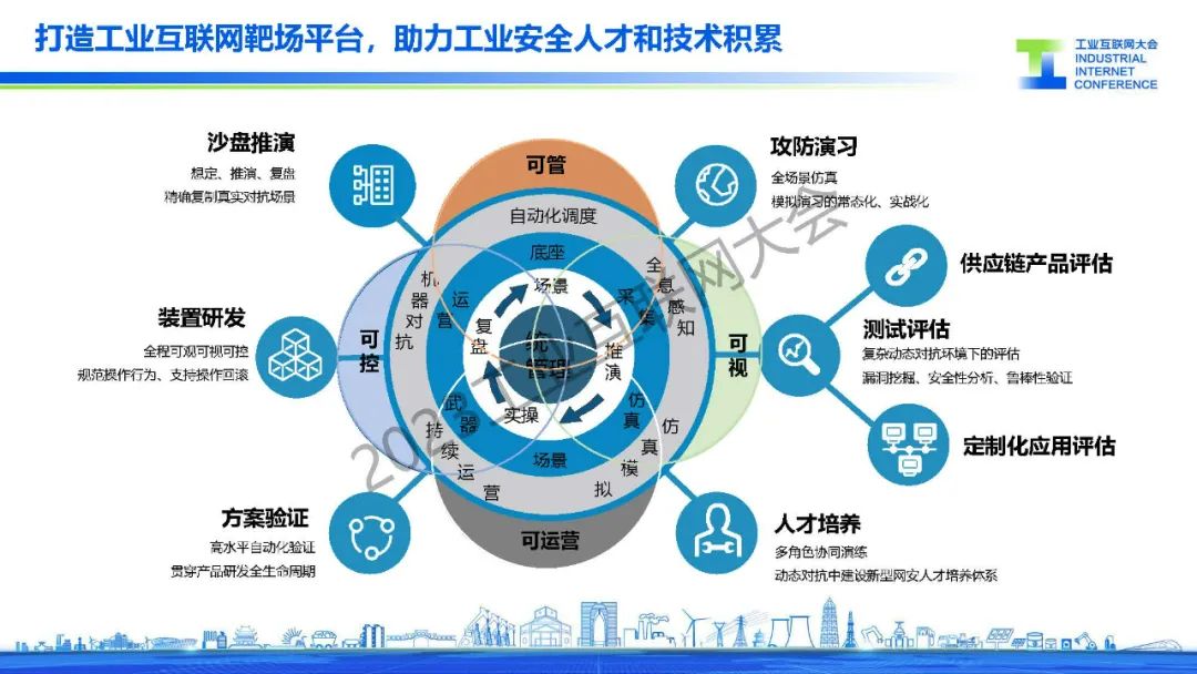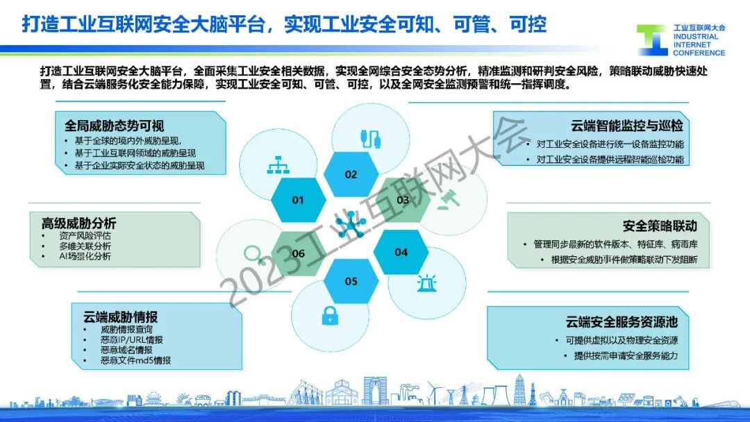 曹東介紹,需要構建安全防護體系、監測體系、處置體系、保障體系,實現最小干擾、深度防護的工業數字化安全。通過打造工業互聯網安全大腦平臺,全面采集工業安全相關數據,實現全網綜合安全態勢分析,精準監測和研判安全風險,策略聯動威脅快速處置,結合云端服務化安全能力保障,實現工業安全可知、可管、可控,以及全網安全監測預警和統一指揮調度。