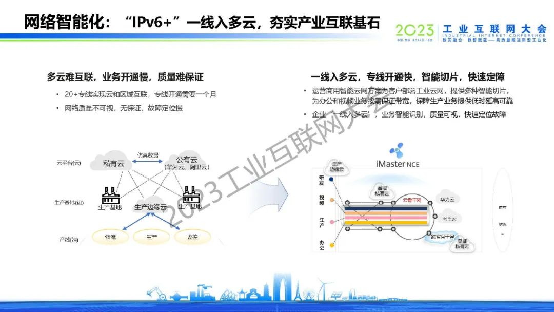 “運營商用智能云網(wǎng)方案為客戶部署工業(yè)云網(wǎng),提供多種智能切片,為辦公和視頻業(yè)務(wù)按需保證帶寬,保障生產(chǎn)業(yè)務(wù)提供低時延高可靠。“