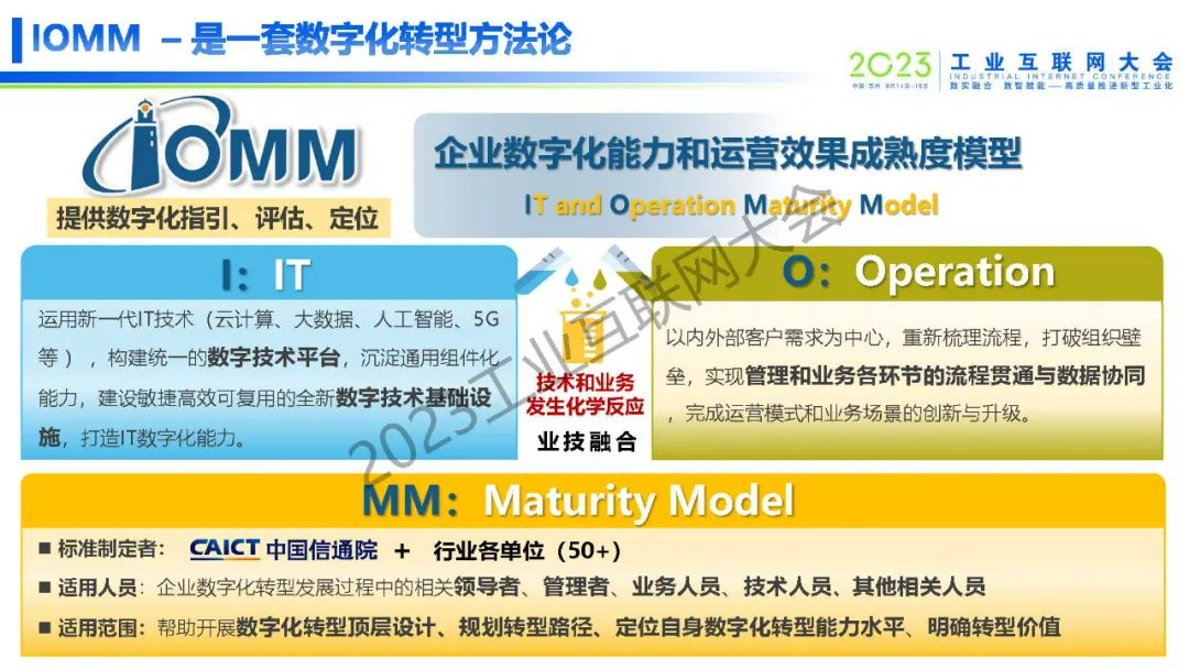 6月14日,在2023工業互聯網大會“工業互聯網助力企業數字化轉型高端論壇”上,中國信息通信研究院云計算與大數據研究所副所長栗蔚發表了《企業數字化能力和運營效果成熟度模型IOMM 2.0發布與解讀》的主題演講。