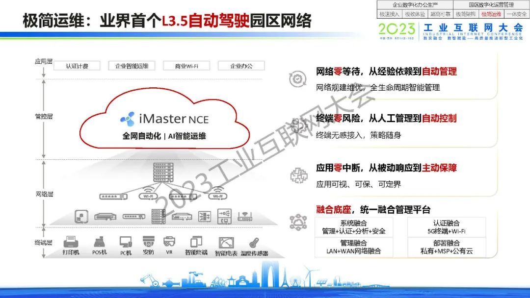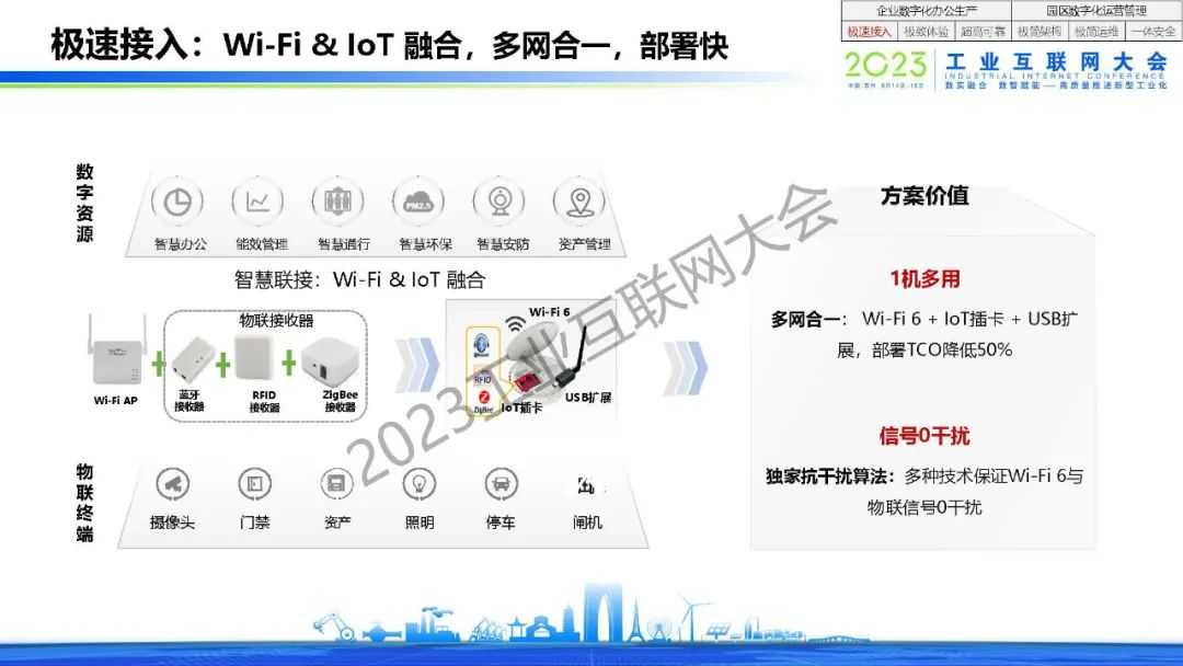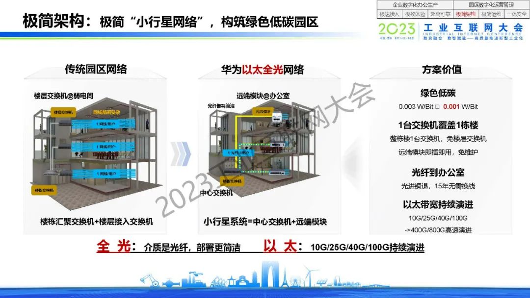 程劍表示,產業園區正進入智慧化4.0時代,園區ICT基礎設施正進入集約化建設模式,企業數字化正在從辦公場景延伸到生產場景。企業數字化辦公生產需要做到極速接入,極致體驗和超高可靠。園區數字化運營管理需要做到極簡架構,極簡運維和一體安全。