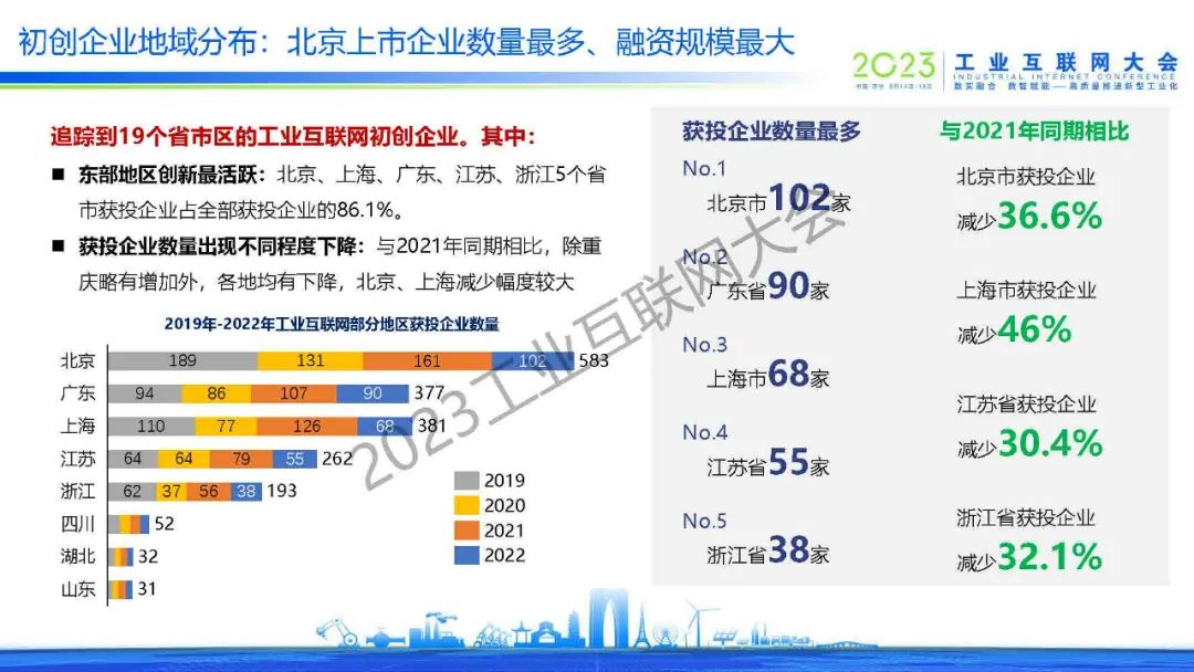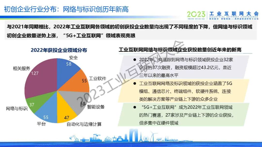 與2021年同期相比,2022年工業(yè)互聯(lián)網(wǎng)各領(lǐng)域的初創(chuàng)獲投企業(yè)數(shù)量均出現(xiàn)了不同程度的下降,但網(wǎng)絡(luò)與標(biāo)識(shí)領(lǐng)域初創(chuàng)企業(yè)數(shù)量逆勢(shì)上漲,“5G+工業(yè)互聯(lián)網(wǎng)”領(lǐng)域表現(xiàn)亮眼。