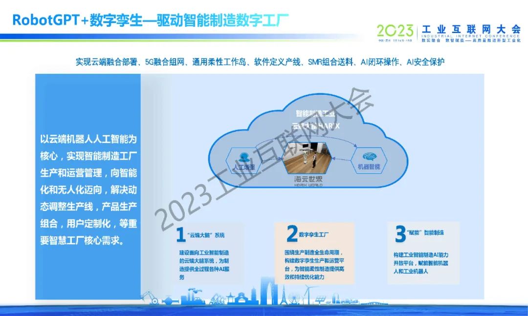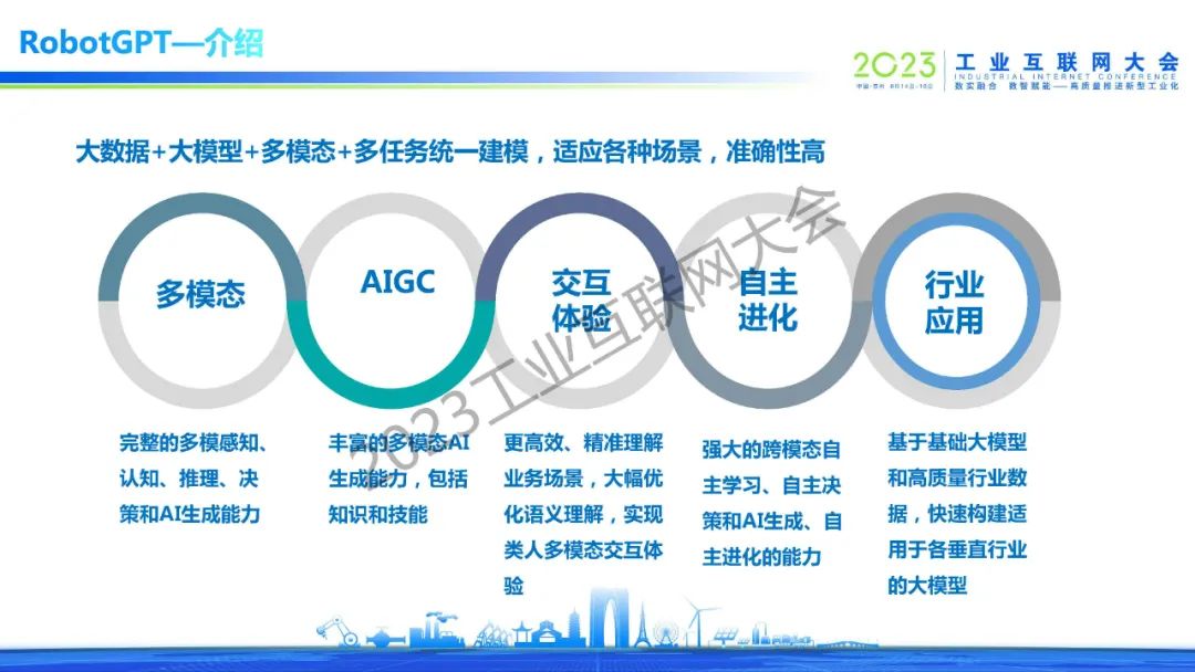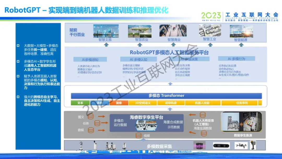 吳興貴指出,人工智能進入新時代,特別是在通用人工智能 (AGI) 領域,多模態預訓練大模型和強化學習 的出現使得人工智能應用更加廣泛,同時生成 式 AI的興起也促進了數字內容的生產和創造, 即將迎來產業爆發。RobotGPT是多模態大模型賦能機器人實現端到端機器人數據訓練和推理優化。
