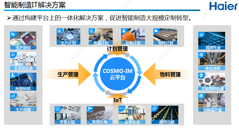 現(xiàn)在海爾集團(tuán)COSMO-MES、WMS、COSMO-Iot (Scada/Automaition)、PLM、ERP等五大系統(tǒng)高效協(xié)同與集成情況為支持工廠轉(zhuǎn)型,海爾搭建了以COSMO-MES系統(tǒng)為核心,包括PLM協(xié)同研發(fā)系統(tǒng)(包含CAD/CAPP/設(shè)計(jì)仿真、制造仿真)、ERP企業(yè)資源計(jì)劃系統(tǒng)、WMS智慧物流、COSMO-Iot智慧設(shè)備控制系統(tǒng)(生產(chǎn)數(shù)據(jù)采集分析等)5大信息系統(tǒng)集成互聯(lián)的信息化體系,業(yè)務(wù)上通過智能的制造,把制造、研發(fā)、物流緊密的互聯(lián)互通,并形成了家電行業(yè)的互聯(lián)工廠的信息化標(biāo)準(zhǔn)。在縱向上實(shí)現(xiàn)了從企業(yè)到工廠到車間到每一臺設(shè)備每一個人的實(shí)時互聯(lián),即機(jī)機(jī)互聯(lián)、機(jī)物互聯(lián)、人機(jī)互聯(lián);橫向上實(shí)現(xiàn)了從用戶的需求再到產(chǎn)品設(shè)計(jì)、制造、物流、服務(wù),整個全流程的供應(yīng)鏈體系的互聯(lián),即虛實(shí)互聯(lián)、信息互聯(lián)、內(nèi)外互聯(lián)。通過搭建的互聯(lián)工廠信息化體系,用戶能夠在全球任何一個地方任何一個時間,通過他的移動終端隨時可以定制他的產(chǎn)品,互聯(lián)工廠也可以隨時感知隨時滿足用戶的需求。