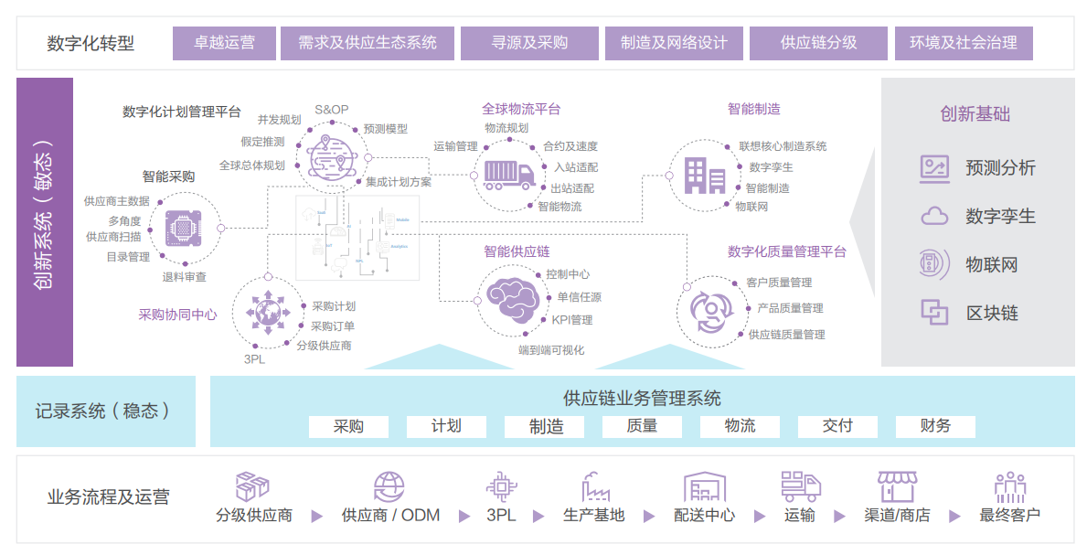 立足當(dāng)下,放眼未來(lái),聯(lián)想正在持續(xù)深化以 3S 戰(zhàn)略為核心的智能化轉(zhuǎn)型,3S 智能化變革戰(zhàn)略中的所 倡導(dǎo)的“端 - 邊 - 云 - 網(wǎng) - 智” 核心架構(gòu)正好和新基建高度契合。而助力制造 業(yè)客戶(hù)實(shí)現(xiàn)智能化轉(zhuǎn)型的終極目標(biāo)就是要從業(yè)務(wù)數(shù)據(jù)化、數(shù)據(jù)場(chǎng)景化、場(chǎng)景流 程化出發(fā),驅(qū)動(dòng)整個(gè)體系的有機(jī)聯(lián)動(dòng),實(shí)現(xiàn)全局的數(shù)字化和智能化的高效協(xié)同。 聯(lián)想作為企業(yè)數(shù)字化轉(zhuǎn)型的推動(dòng)者和賦能者,能夠?yàn)橹圃鞓I(yè)提供全棧的端到端的轉(zhuǎn)型解決方案,實(shí)現(xiàn)行業(yè)賦能。