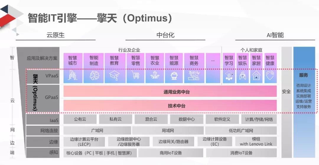 聯(lián)想智能IT引擎“擎天”是基于“端-邊-云-網(wǎng)-智”新IT架構(gòu)的內(nèi)核,包含了技術(shù)中臺(tái)和通用業(yè)務(wù)中臺(tái)的GPaaS層,以及面向不同行業(yè)領(lǐng)域的VPaaS層,具有云原生、中臺(tái)化、AI智能三大技術(shù)特征。
