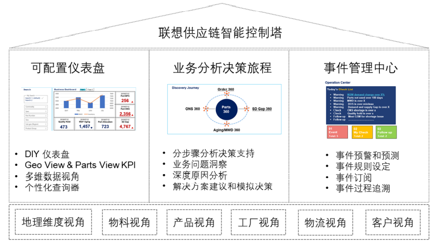 供應(yīng)鏈智能控制塔是供應(yīng)鏈運(yùn)作的指揮中心??刂扑峁┝巳轿灰暯?,打通 了端到端的數(shù)據(jù)鏈接,能更全面的從客戶(hù)、區(qū)域、運(yùn)輸、物料、產(chǎn)品,工廠等不同維度來(lái)審視 供應(yīng)鏈的業(yè)務(wù)問(wèn)題和改進(jìn)點(diǎn)。功能特性包含了可配置儀表盤(pán)、業(yè)務(wù)分析決策旅程和業(yè)務(wù)事件管 理中心。