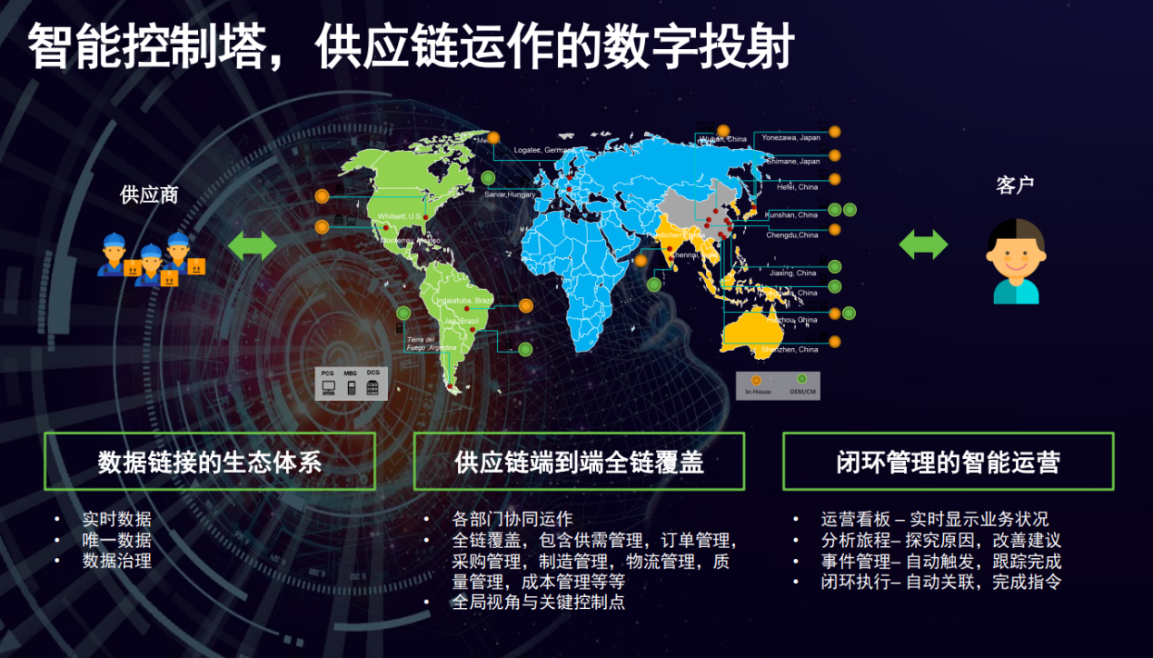 聯(lián)想供應(yīng)鏈智能控制塔以客戶(hù)為中心,構(gòu)建包括計(jì)劃、采購(gòu)、制造、物流、質(zhì)量、服務(wù)等環(huán)節(jié)的一體化協(xié)同,力求在供應(yīng)鏈生態(tài)體系內(nèi)實(shí)現(xiàn)全面運(yùn)營(yíng)最優(yōu)化方案運(yùn)作,提升整體運(yùn)作效率。