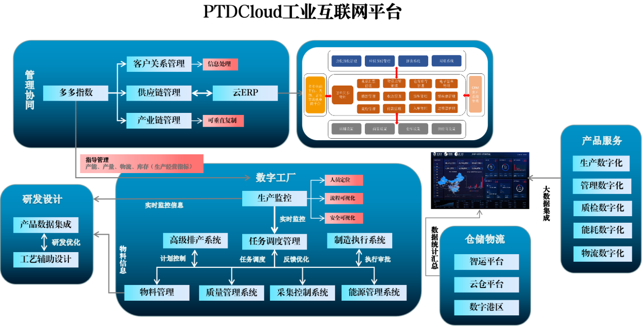 PTDCloud工業(yè)互聯(lián)網(wǎng)平臺服務于“交易、物流、倉儲、金融、生產(chǎn)”五個需求和“客戶、供應商、資金、設備、員工、產(chǎn)品”六個連接,旨在實現(xiàn)設備全量數(shù)據(jù)采集與生產(chǎn)全域數(shù)據(jù)整合,實現(xiàn)交易數(shù)字化、供應鏈數(shù)字化、管理數(shù)字化、生產(chǎn)數(shù)字化。