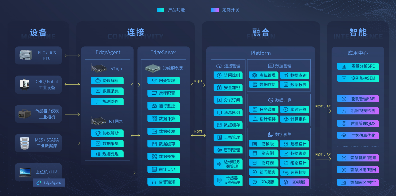 針對用戶的設備連接、系統(tǒng)協(xié)同、數(shù)據(jù)分析等需求,邊緣接入、數(shù)據(jù)采集、時序存儲、數(shù)據(jù)計算、數(shù)字孿生、數(shù)據(jù)可視化等能力、為企業(yè)提供從現(xiàn)場設備、傳感器、儀表接入到智能應用服務的端到端解決方案,構建智能監(jiān)測系統(tǒng),實現(xiàn)工廠設備運行狀態(tài)、各位置耗能耗電情況、產(chǎn)品生產(chǎn)質(zhì)量等實時遠程監(jiān)測。優(yōu)化、創(chuàng)新乃至重構企業(yè)戰(zhàn)略決策、產(chǎn)品研發(fā)、生產(chǎn)制造、經(jīng)營管理、市場服務業(yè)務活動,構建數(shù)據(jù)驅(qū)動型高效運營管理模式。是各類制造企業(yè)數(shù)字化、智能化轉(zhuǎn)型、實現(xiàn)卓越運營的強大利器。