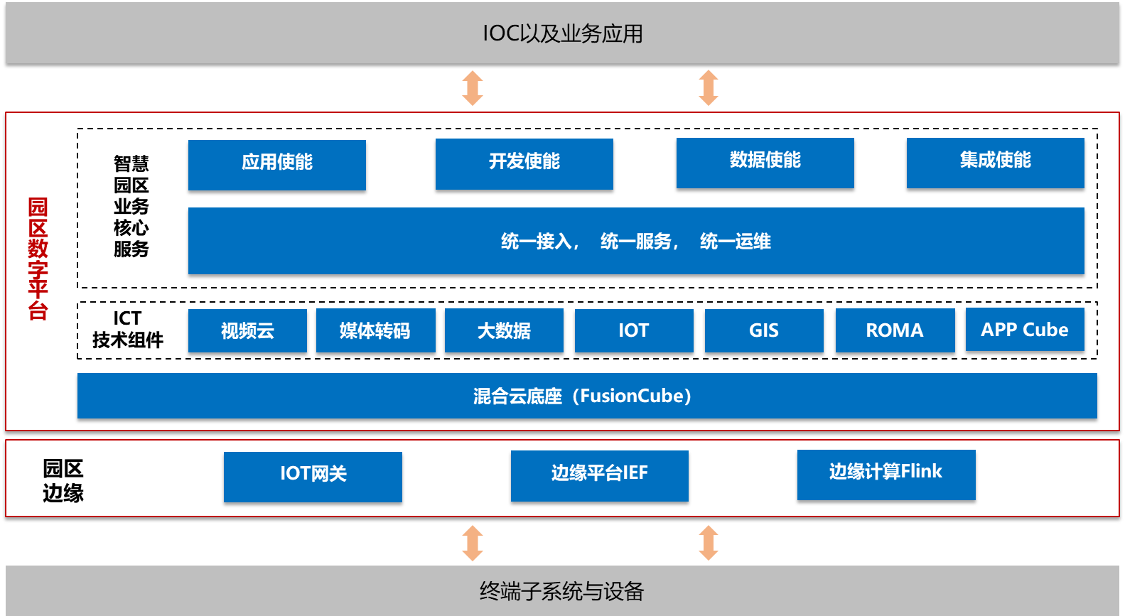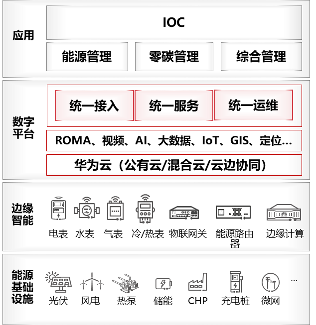在技術(shù)方案方面,園區(qū)采用了最新的5G和WiFi6技術(shù),實現(xiàn)園區(qū)無線網(wǎng)絡(luò)的全覆蓋。在園區(qū)廣泛部署智能物聯(lián)網(wǎng)關(guān)、智能攝像頭、能源路由器等邊緣智能設(shè)備,實現(xiàn)對園區(qū)人、車、物、能、碳等各種數(shù)據(jù)的全面采集。依托云、大、物、智等技術(shù)構(gòu)建的數(shù)字平臺,對園區(qū)數(shù)據(jù)實現(xiàn)統(tǒng)一接入和匯聚、融合,對設(shè)備實現(xiàn)統(tǒng)一運維,對業(yè)務(wù)應(yīng)用實現(xiàn)統(tǒng)一服務(wù)。綜合運營中心IOC實現(xiàn)園區(qū)各子系統(tǒng)的態(tài)勢感知、運營狀態(tài)可視化、業(yè)務(wù)分析和預(yù)警、決策支持和聯(lián)動指揮,實現(xiàn)對園區(qū)的智慧化管理。