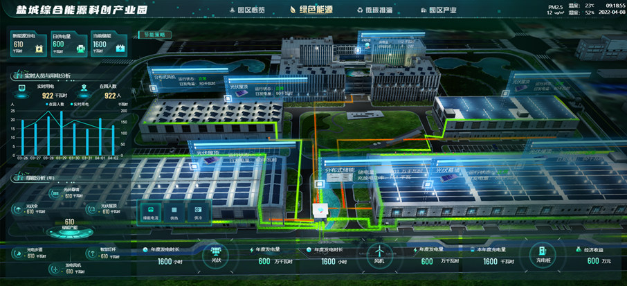 基于園區(qū)全電能源消費優(yōu)勢,依托鹽城市較高的新能源電力比例基礎(chǔ)上,依靠園區(qū)部署多種風(fēng)光發(fā)電設(shè)備以及地源熱泵系統(tǒng),目標(biāo)做到清潔能源生產(chǎn)占比85%。部署多種綠能設(shè)備的同時,引入儲能設(shè)備與綜合能源管理系統(tǒng),進一步提升綠色能源在節(jié)能降碳和多種能源互補效果。集成了能源EMS系統(tǒng)、地源熱泵及氣象站數(shù)據(jù),利用GIS數(shù)字孿生技術(shù),對園區(qū)綠能電力、供冷、供熱進行空間實時流向展示及數(shù)據(jù)多維度分析。通過IoT、數(shù)據(jù)算法等技術(shù)對用能進行智能調(diào)控,達到能源最優(yōu)化、辦公環(huán)境最佳化。通過EMS系統(tǒng)一鍵控制綠能策略執(zhí)行,通過數(shù)字平臺能夠看到綠能執(zhí)行的流向情況。
