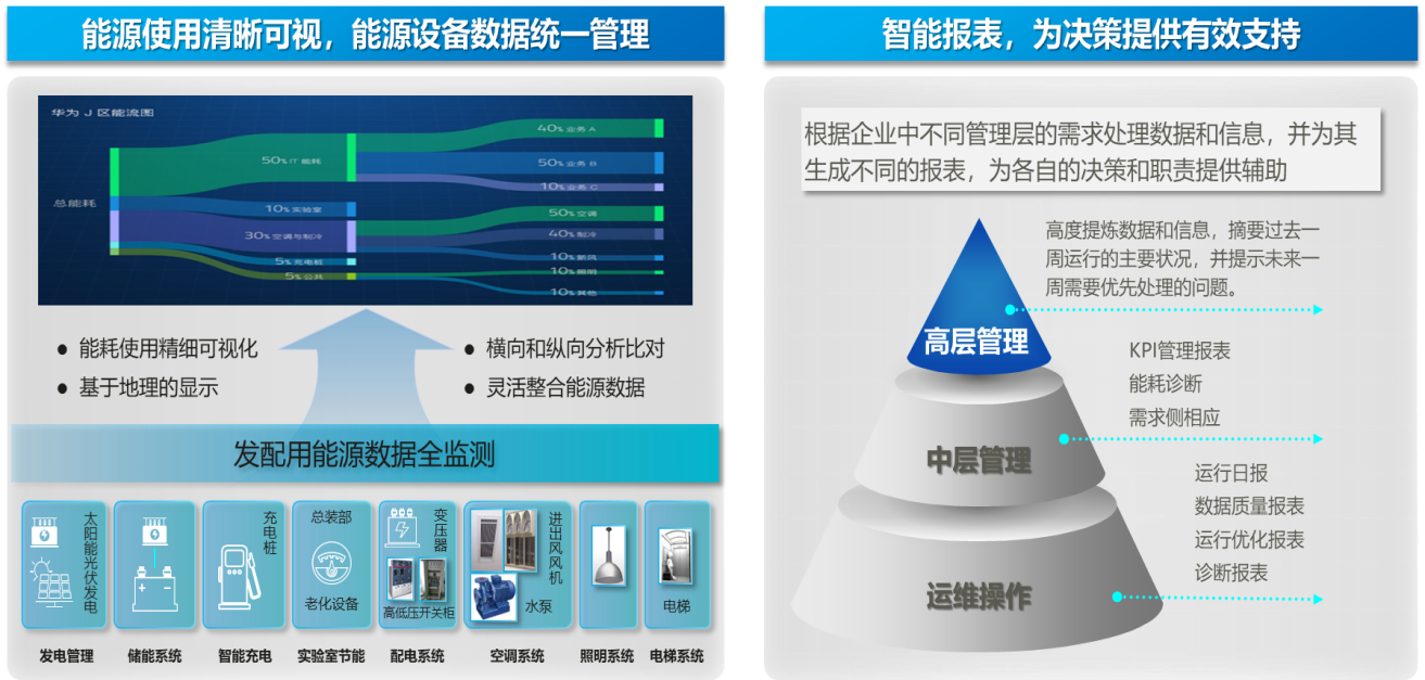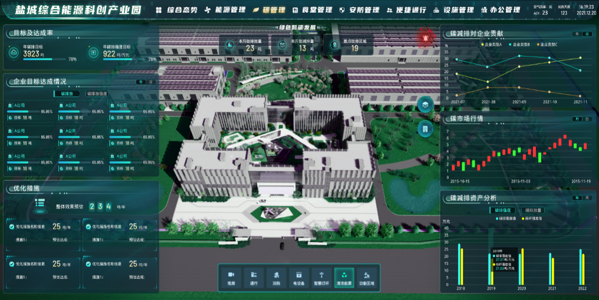 在園區(qū)碳排放管理方面,構(gòu)建了一整套體系化、自動化、圖形化的碳排放管理系統(tǒng),替換掉手工填報維護的方案,直觀地從各個維度進行碳排放分析和減碳趨勢分析。碳排放盤查功能提供按時間維度、業(yè)務(wù)維度(如部門、設(shè)備等)統(tǒng)計碳排放情況,用于各維度下的碳排放統(tǒng)計分析,為減碳決策提供數(shù)據(jù)支撐。統(tǒng)計報表以時間維度,統(tǒng)計所有登記設(shè)備的用能情況,并以報表方式呈現(xiàn),通過與園區(qū)運營中心對接,完成統(tǒng)計報表或圖形展示。建立專項碳排放數(shù)據(jù)庫,對每階段的碳排放情況進行分析,將碳排放單位每階段(按日或月)的電耗、冷耗、熱耗、水耗等情況做成曲線圖,分析走勢,歸納總結(jié)。數(shù)據(jù)統(tǒng)計分析功能分析園區(qū)以及企業(yè)總體能耗情況、能源消耗單項指標(biāo)、單位產(chǎn)品能耗情況、產(chǎn)值能耗情況、綜合能源產(chǎn)能情況、節(jié)能狀況、能源消費品種構(gòu)成、能源消費結(jié)構(gòu)等。