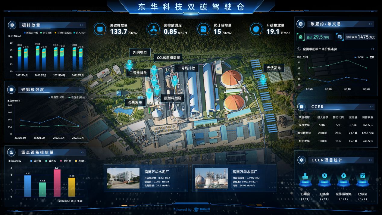 雙碳雙控平臺集成核算系數管理能力,按照《中國水泥生產企業溫室氣體排放核算方法與報告指南(試行)》中規定的核算方法,利用碳采集所得數據計算企業碳排放總量、不同分廠(事業部)碳排放量、不同產品碳排放量,以可視化的方式展示。并為企業提供碳履約,碳交易服務。平臺落地后,通過合理化的碳履約策略配置和綠色技改,預計可為東華科技年節約200萬元的碳履約成本。