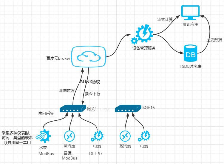 平臺(tái)層:百度天工AIoT平臺(tái)層主要提供安全穩(wěn)定的IoT數(shù)據(jù)接入、及時(shí)有效的數(shù)據(jù)處理及聚合計(jì)算,它具有高可靠數(shù)據(jù)庫服務(wù),豐富的平臺(tái)數(shù)據(jù)接口支持,是保障能源管理服務(wù)的技術(shù)基石。AIoT接入服務(wù)為設(shè)備提供安全可靠的連接通信能力,向下連接海量設(shè)備,支撐設(shè)備數(shù)據(jù)采集上云;向上提供云端API,指令數(shù)據(jù)通過API調(diào)用下發(fā)至設(shè)備端,實(shí)現(xiàn)遠(yuǎn)程控制。