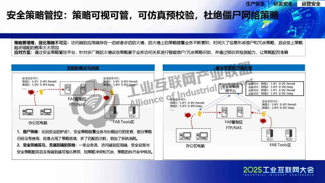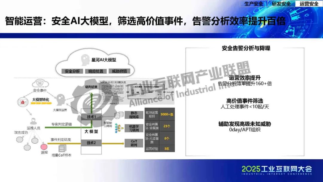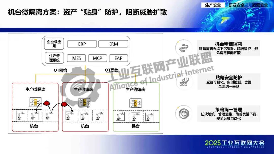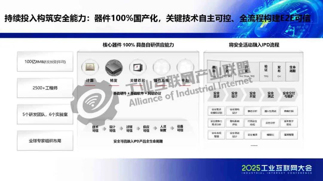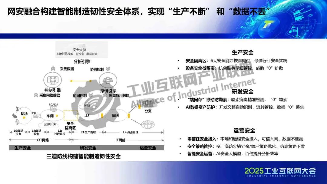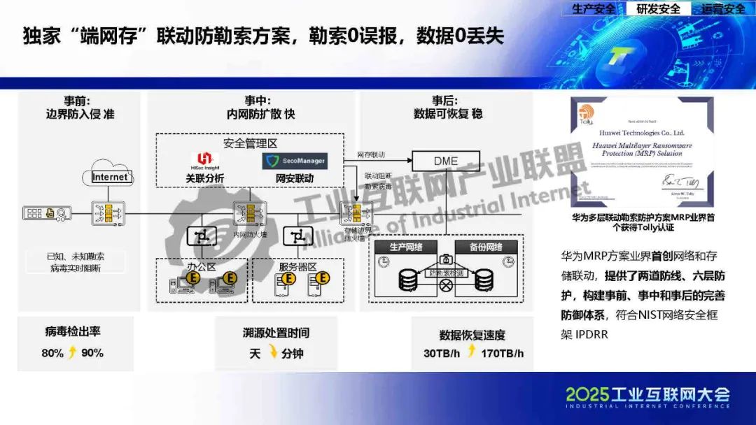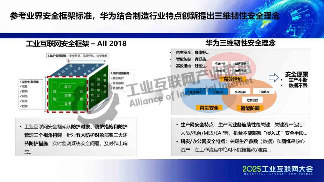 張光明介紹,參考業界安全框架標準,華為結合制造行業特點創新提出三維韌性安全理念。該理念通過內生安全、智能防御和高效運維,結合檢測分析、威脅可視、策略聯動和響應恢復,采用全流程可信設計,關鍵器件100%國產化,達到非侵入式安全隔離區實現IT/OT隔離、機臺微隔離阻斷橫向威脅擴散、業界首創"端網存"聯動防勒索方案、零信任動態授權確保安全接入、AI大模型提升安全運營效率160倍等效果,已助力某半導體企業實現4年業務零中斷,累計防御攻擊超6240萬次。華為方案獲得Gartner等權威機構認可,實現"生產不斷、數據不丟"的安全目標。