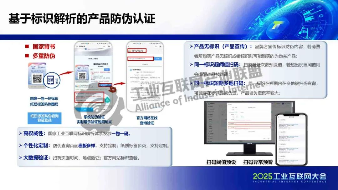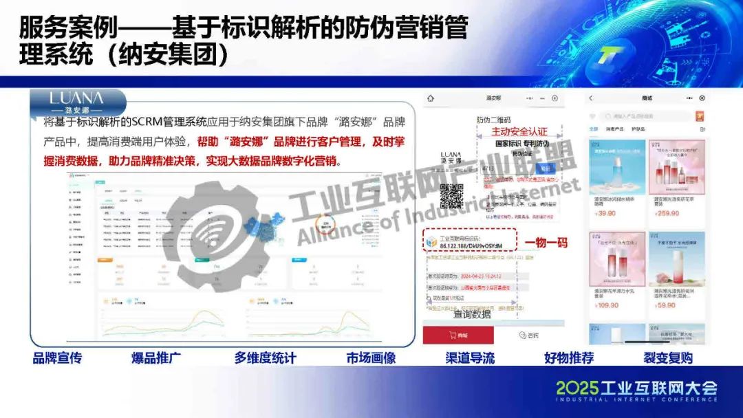 霍健介紹,工業互聯網唯一標識碼可以關聯產品生產端至銷售端全流程信息,還可讓每一件產品成為品牌流量入口,變成移動的廣告牌,實現品牌精準營銷、裂變復購等功能,提高產品競爭力,有力保護消費者的利益,增強消費者對產品的信任度,實現全渠道復購增購。將基于標識解析的SCRM管理系統應用于產品中,可以提高消費端用戶體驗,幫助品牌進行客戶管理,及時掌握消費數據,助力品牌精準決策,實現大數據品牌數字化營銷。