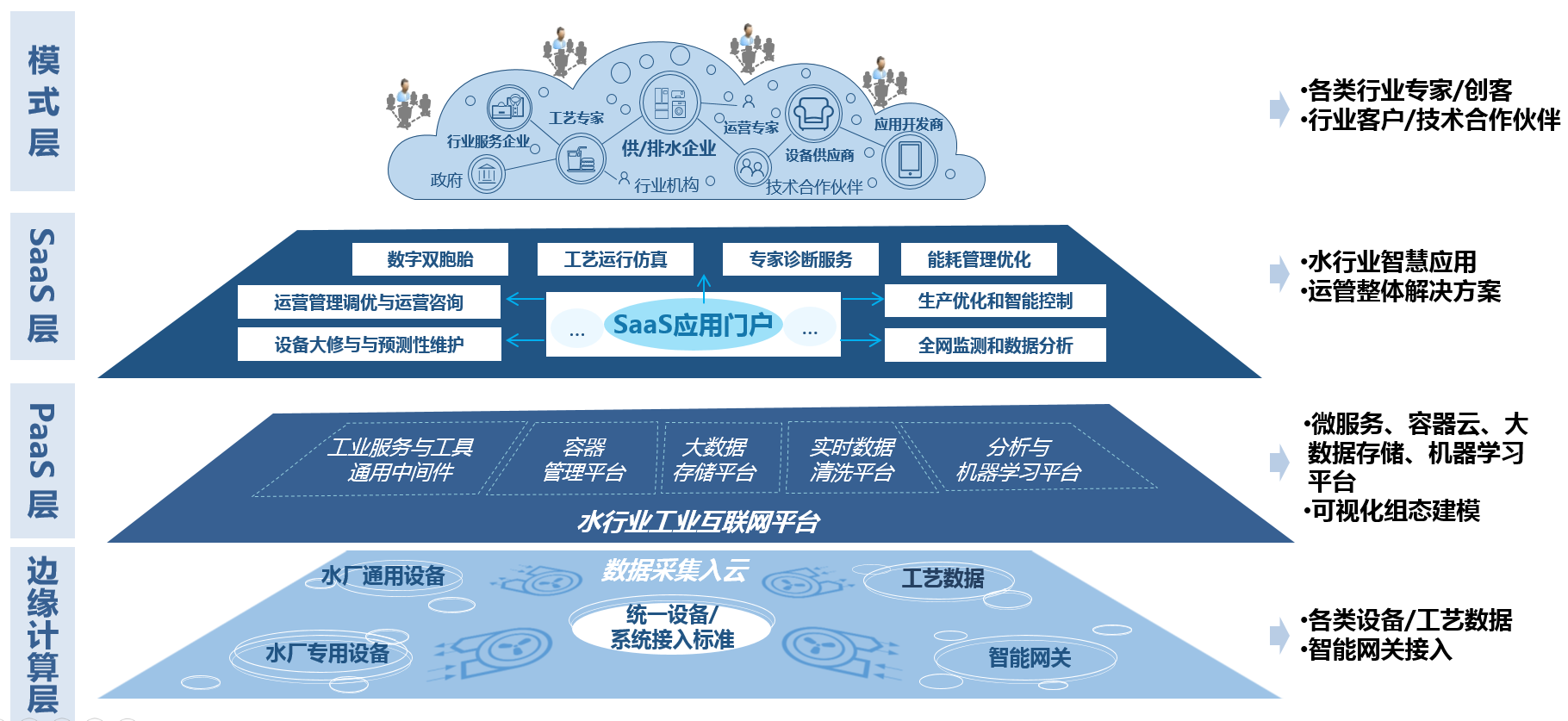 智慧水務運營管理平臺在技術創新上采用了融合邊緣計算和云計算的基礎架構,包括設備層、PaaS層和SaaS層和模式層。