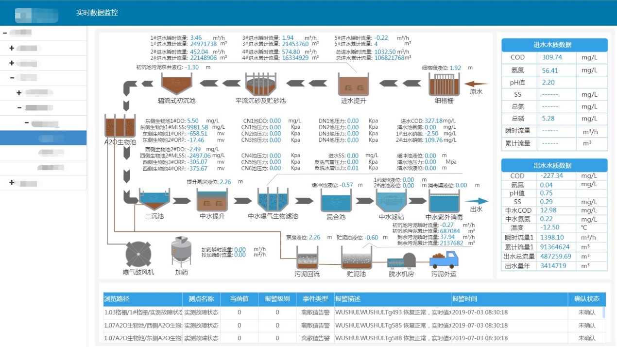 對污水處理廠不同種工藝段圖形化展示,可以實時展示每種工藝段中設備實時狀態和儀表實時數據。提高數據反饋時效性,將實時數據最新的變化情況及時展示,當現場出現設備或儀表的告警時,可實時獲取這些告警信息,在第一時間展示給現場操作人員。