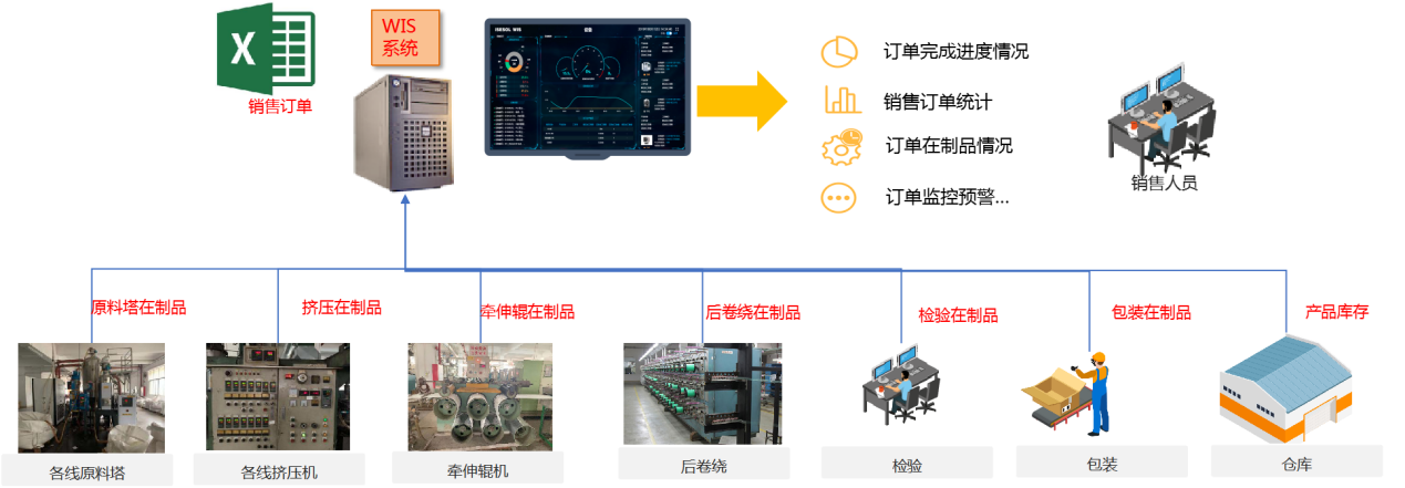 通過WIS系統完成對銷售訂單的管理,以及對銷售訂單執行情況的跟蹤,可實時掌握銷售訂單完成情況,系統根據在制品情況、庫存情況、生產加工節拍,自動進行訂單遇超期預警,同時支持銷售訂單管理、訂單進度統計、訂單超期預警,為銷售部門與生產部門協同提供信息實時穿透。