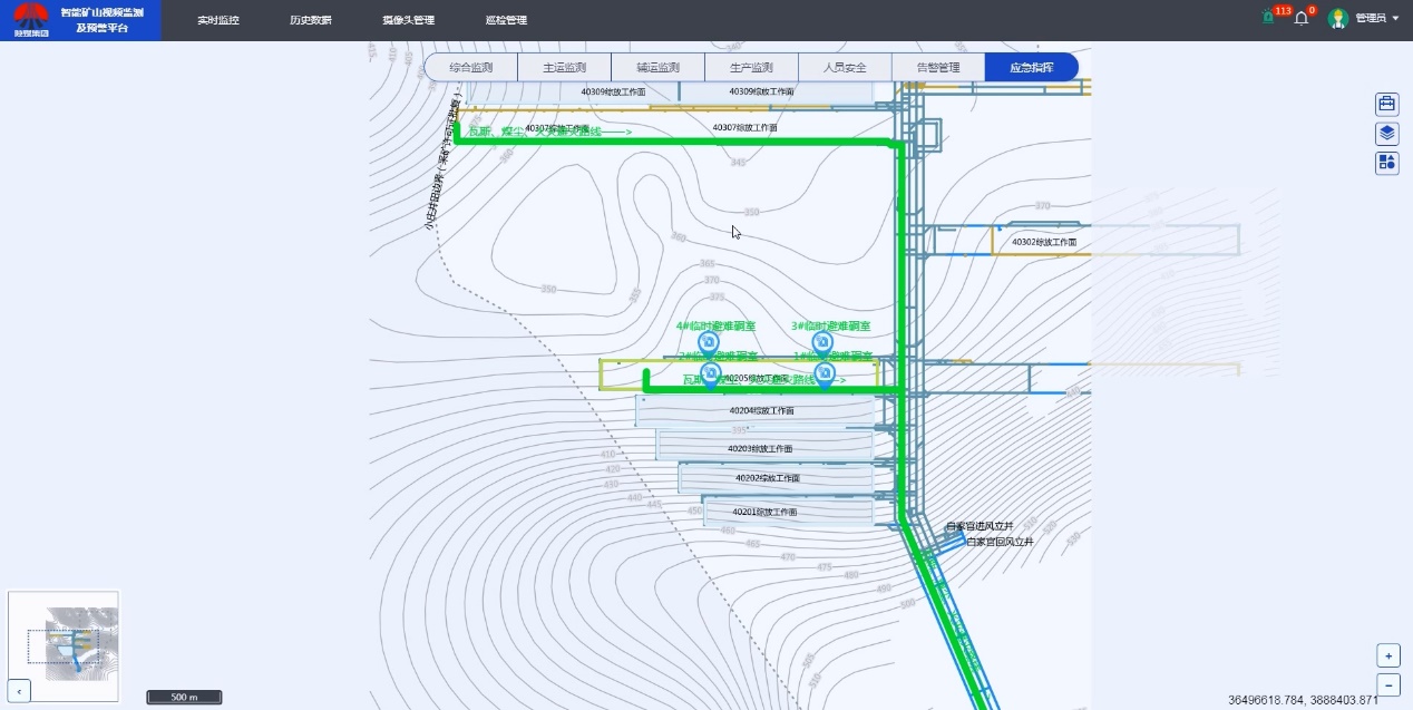 建設(shè)應(yīng)急管理與應(yīng)急救援系統(tǒng),建立實景三維應(yīng)急管理平臺,融合井下安全監(jiān)測、調(diào)度通信、應(yīng)急廣播、人員定位、視頻監(jiān)控系統(tǒng),實現(xiàn)生產(chǎn)事故應(yīng)急預(yù)案管理、災(zāi)害預(yù)警、信息發(fā)布、應(yīng)急響應(yīng)一體化、應(yīng)急救援指揮可視化、應(yīng)急資源共享,輔助實現(xiàn)礦井事故應(yīng)急演練等功能。