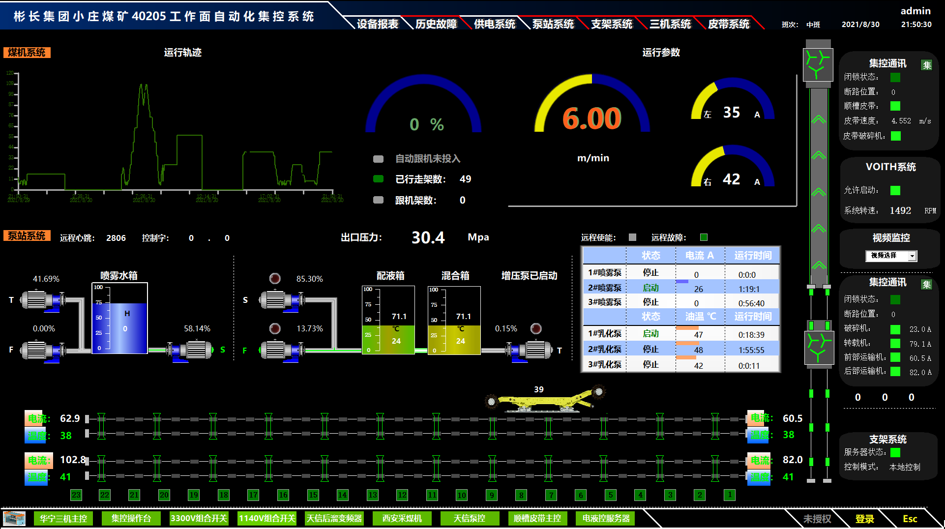 實現(xiàn)直線度檢測、防碰撞檢測控制功能;采煤機(jī)實現(xiàn)人員接近自動停機(jī)功能;與工作面地質(zhì)保障系統(tǒng)聯(lián)動,實現(xiàn)采煤機(jī)自適應(yīng)割煤功能;刮板輸送機(jī)實現(xiàn)鏈條自動張緊功能;膠帶輸送機(jī)實現(xiàn)異物檢測和帶速智能調(diào)節(jié)功能;工作面實現(xiàn)基于煤塵監(jiān)測的智能噴霧降塵功能。
