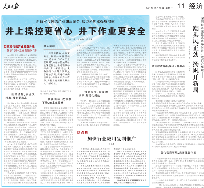 11月4日,小莊礦業(yè)“5G+智慧礦區(qū)”項目作為重點案例,由國家產(chǎn)業(yè)互聯(lián)網(wǎng)專家委員會主任、應(yīng)急管理部礦山智能化專家委員會專家,“國家千人計劃”專家范濟(jì)安教授書面匯報礦山安監(jiān)局安全基礎(chǔ)司、工業(yè)和信息化部通信管理局。接下來,項目將在陜西煤業(yè)化工集團(tuán)37對生產(chǎn)礦井復(fù)制,進(jìn)而在全國同類型礦井約1300對復(fù)制。根據(jù)國家礦山安全檢查局的建議,項目還可在地面礦山和能源行業(yè)復(fù)制。