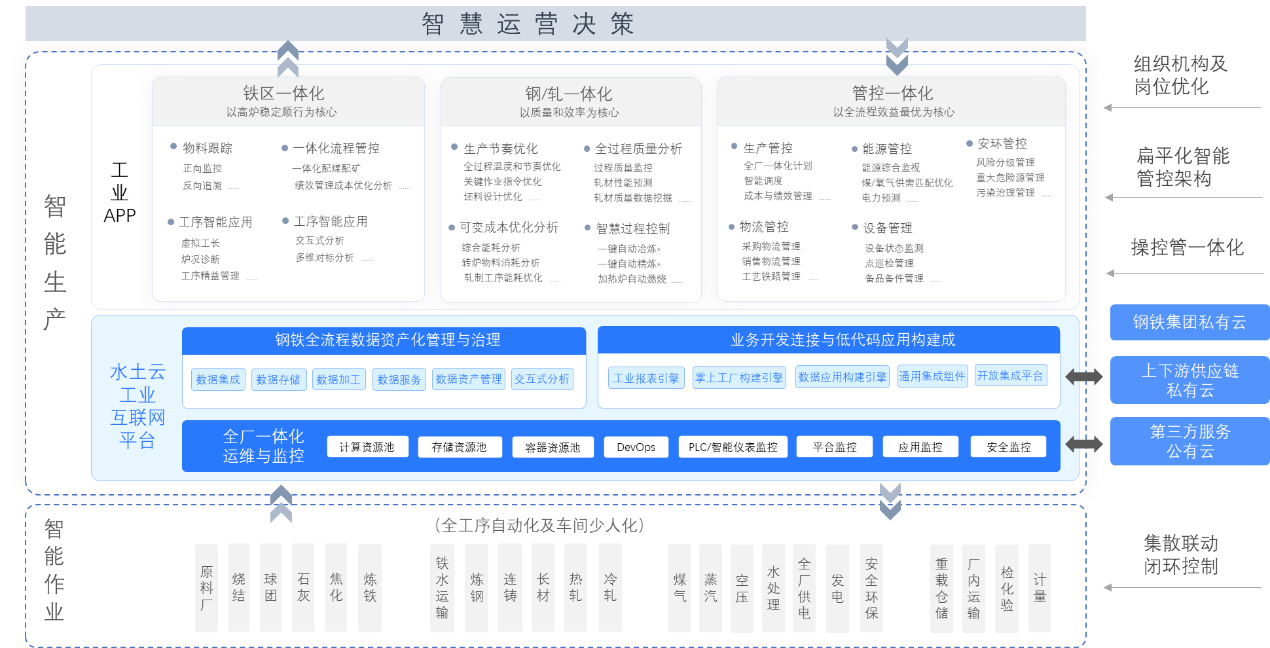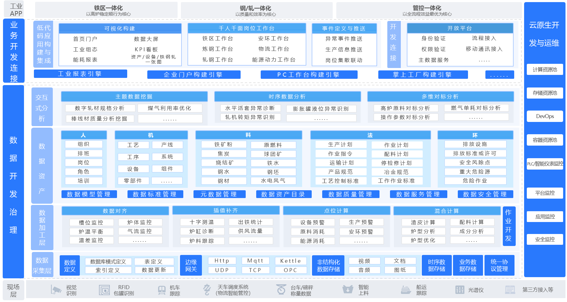 水土云工業互聯網平臺深度融合鋼鐵工藝知識和應用場景,形成了“一個平臺+三個一體化”的新型鋼鐵行業智能制造架構,即以工業互聯網平臺為數字底座,以鐵區一體化、鋼軋一體化、管控一體化為思路,建設超大規模鋼鐵一體化智能管控應用。整體解決方案基于鋼鐵行業特征,以私有云架構,向下連接生產車間自動化系統以及智能傳感設備等,向上支撐全廠全流程生產管控業務。具體架構如圖1所示。